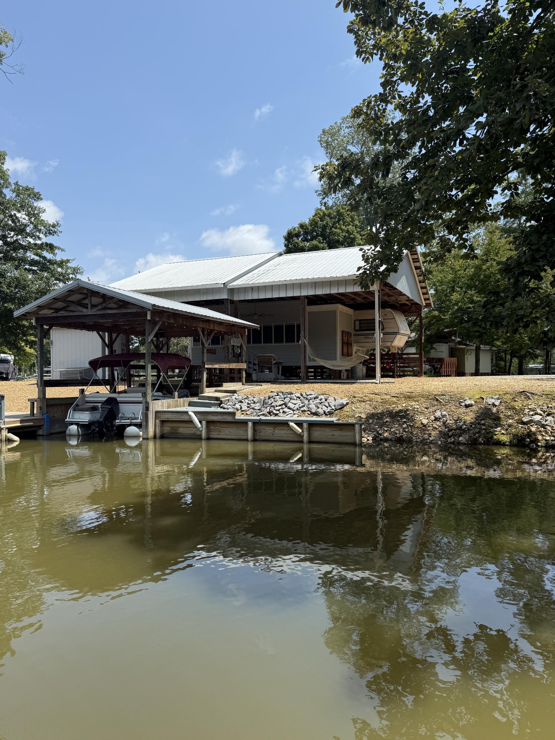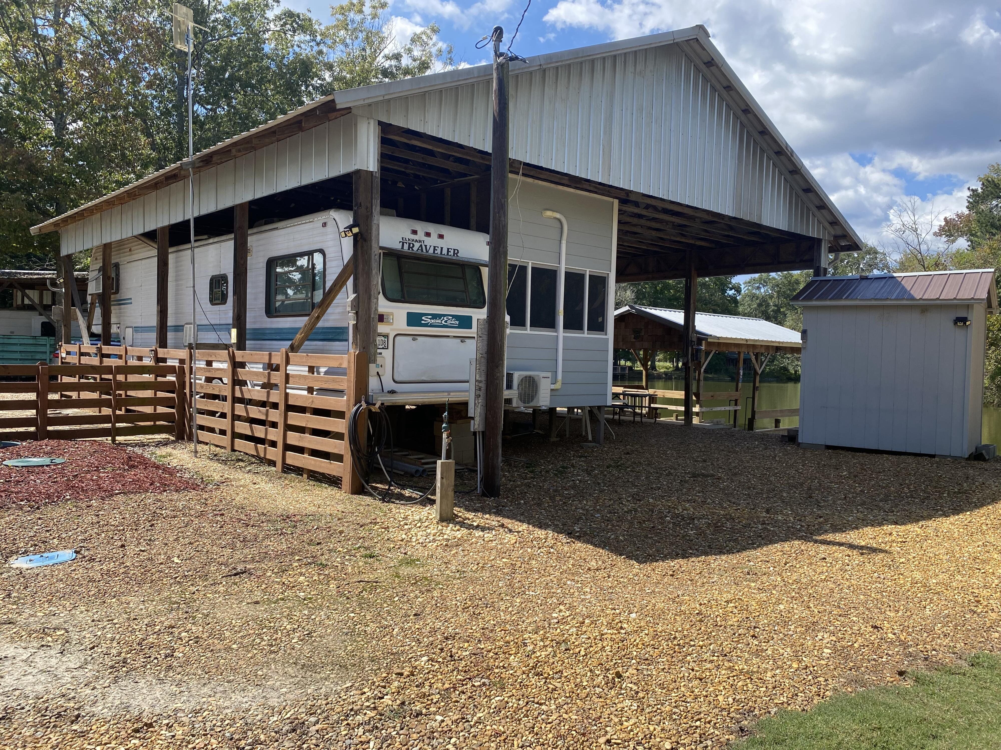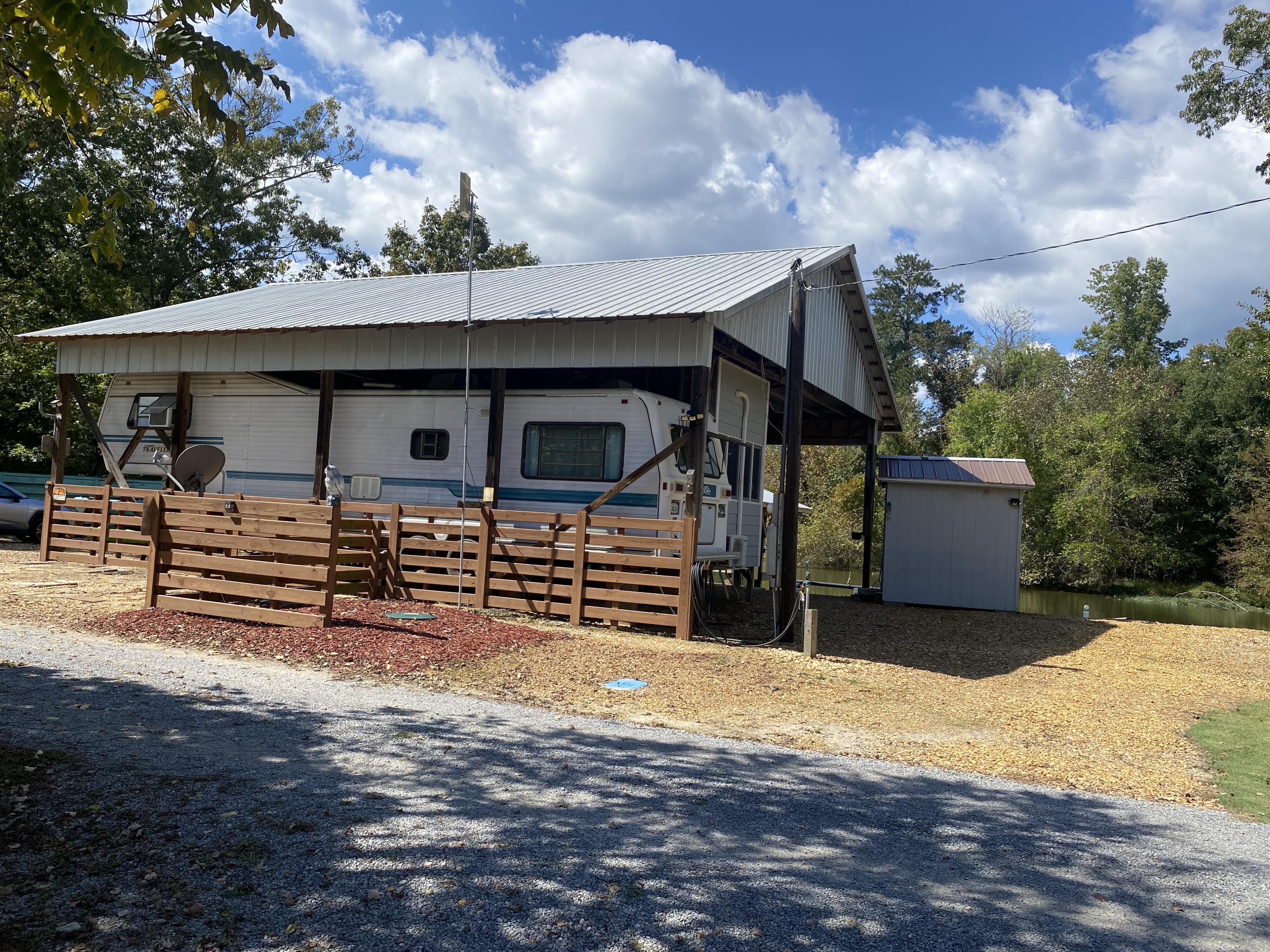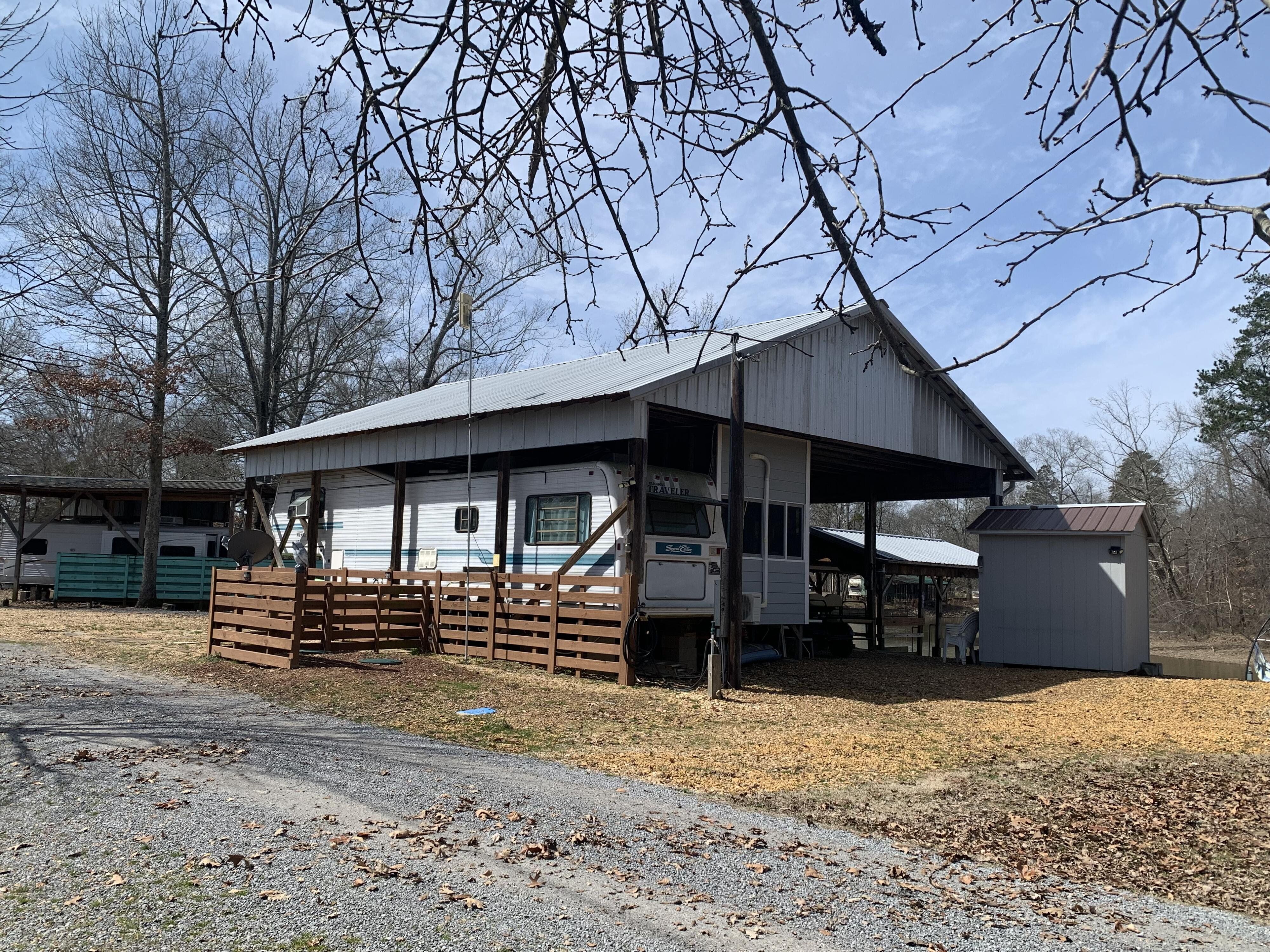 Don't miss this rare opportunity to find peace and serenity with river life off of Coosa River (Weiss Lake). Over 120' of waterfront. This is (2) lots (approx 10,000 sq ft) with plenty of parking for friends and family. Completely covered in river rock. The camper is fully electric with an attached sunroom that has mini split unit with heating/air to enjoy year-round. There are (2) full bathrooms with a stackable washer/dryer. The covered boat slip is big enough for a pontoon, and the side docks has plenty of room for a bass boat and (2) jet skis - so bring your toys & family and come have a blast. There is a 30x40 awning, 1000 gallon holding tank with alarm, 8x8 storage shed for all your fishing gear, and (2) separate hot water tanks. Convenient boat ramp within minutes away. Plenty of room to add an additional camper for guest or teens to have their own space. This property is a strong candidate for rental income.