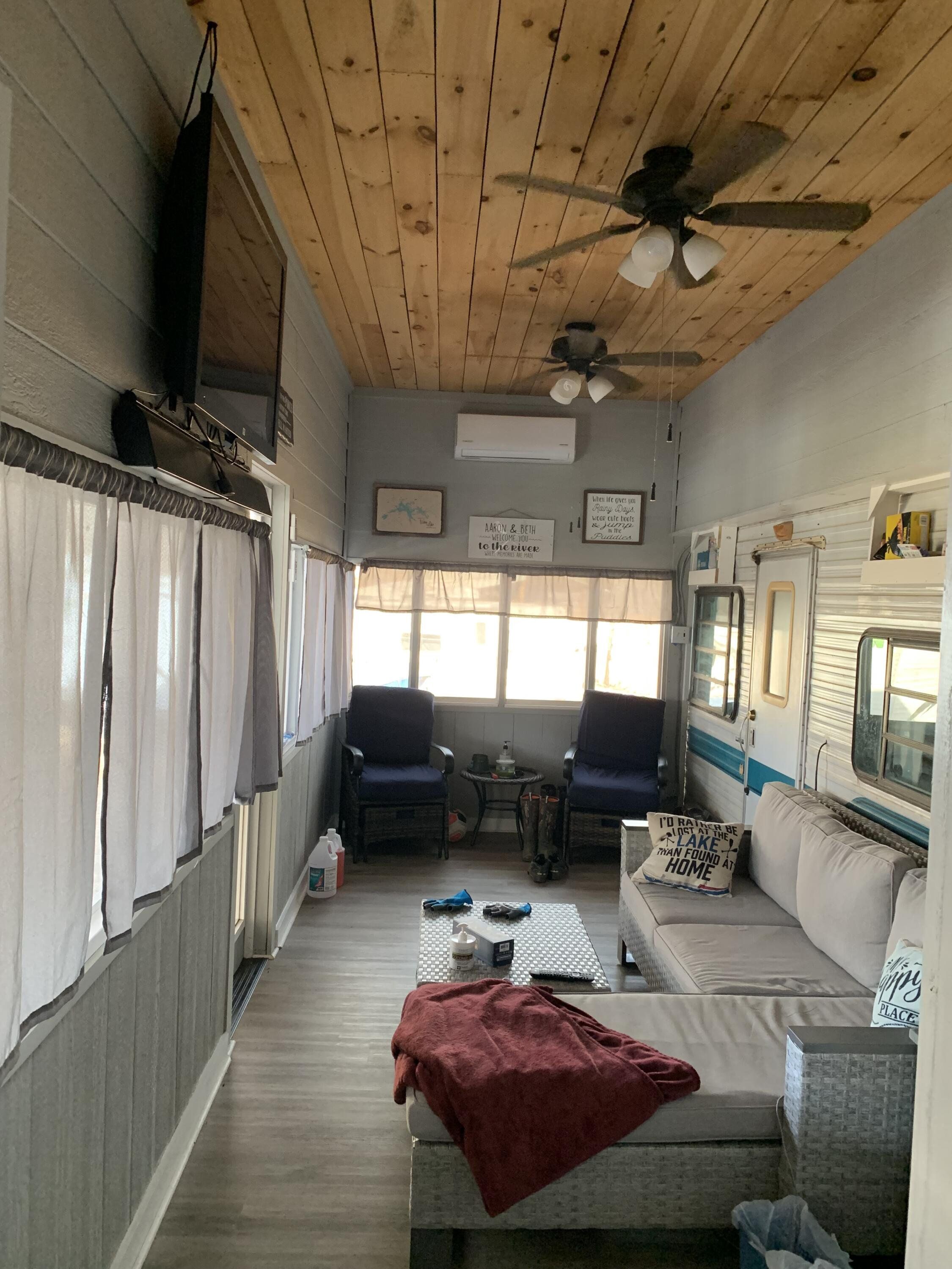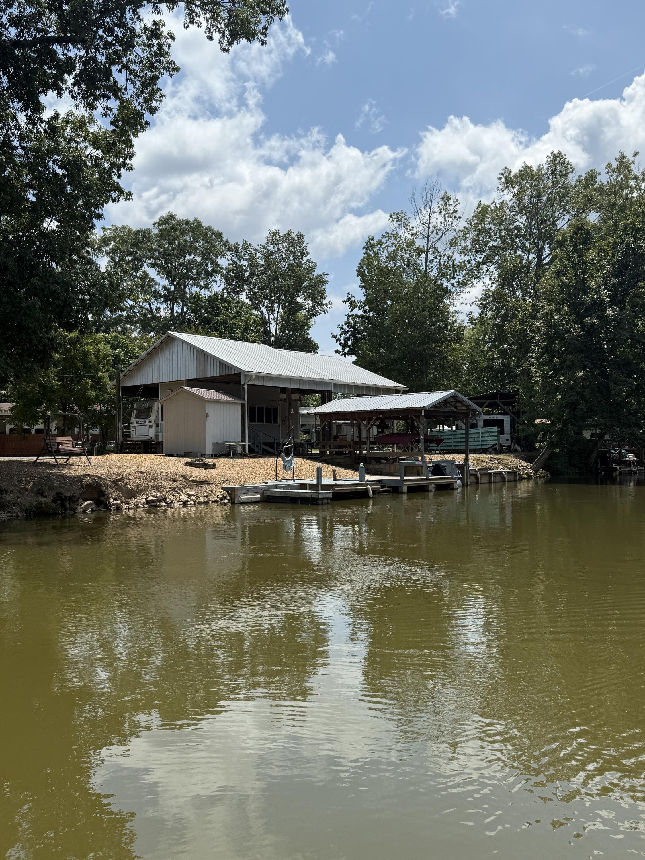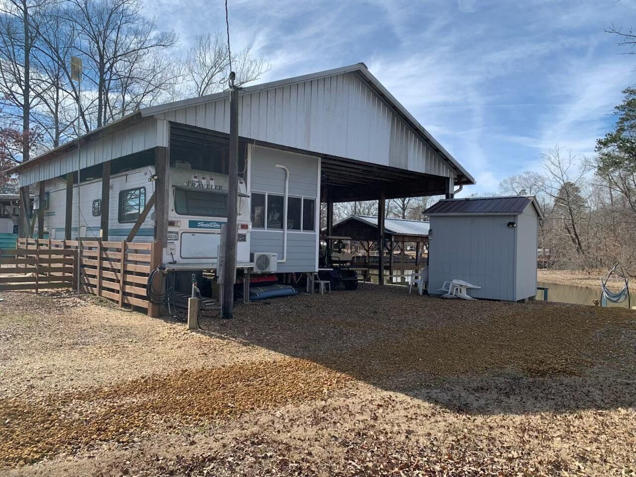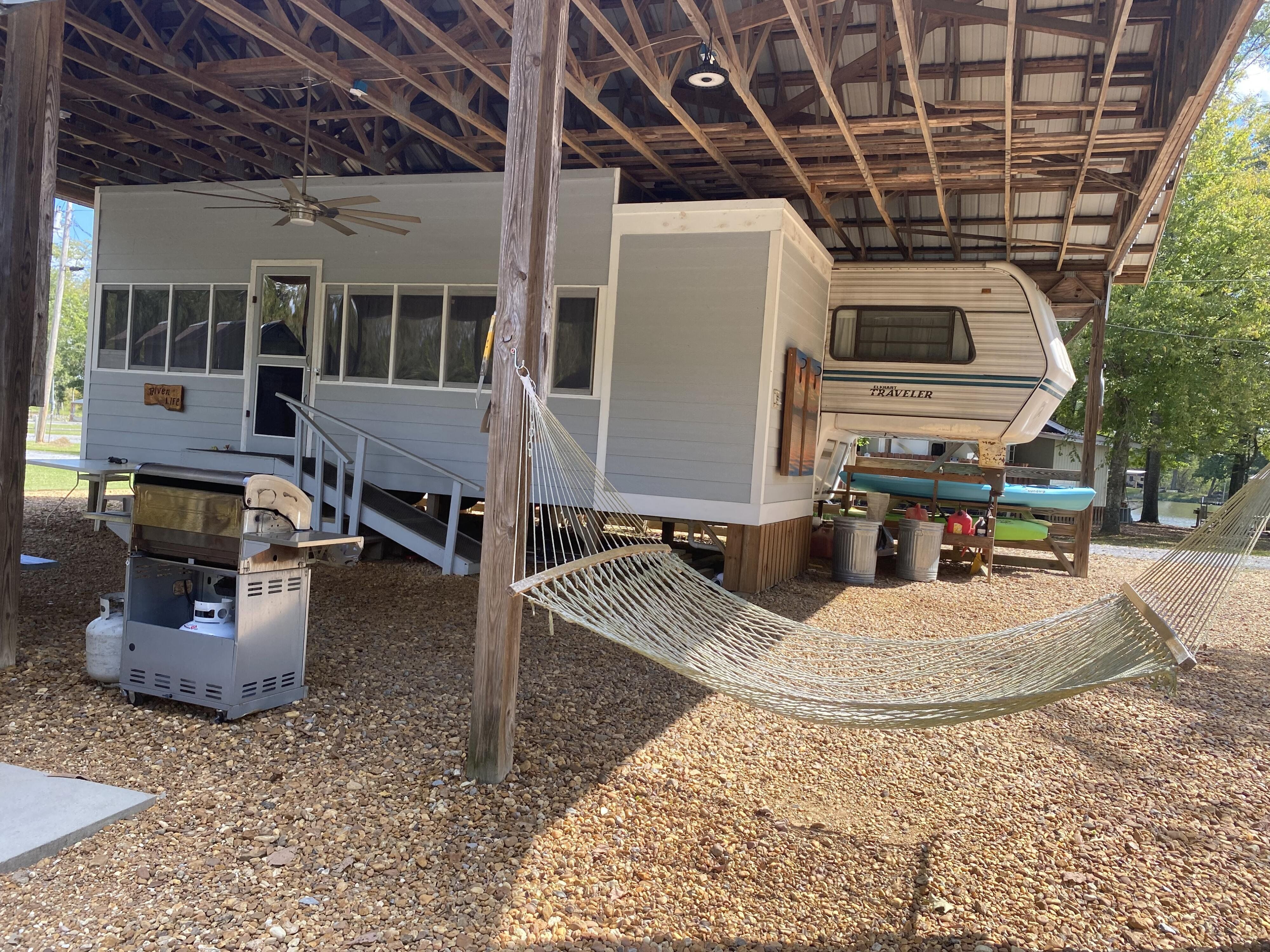 Don't miss this rare opportunity to find peace and serenity with river life off of Coosa River (Weiss Lake). Over 120' of waterfront. This is (2) lots (approx 10,000 sq ft) with plenty of parking for friends and family. Completely covered in river rock. The camper is fully electric with an attached sunroom that has mini split unit with heating/air to enjoy year-round. There are (2) full bathrooms with a stackable washer/dryer. The covered boat slip is big enough for a pontoon, and the side docks has plenty of room for a bass boat and (2) jet skis - so bring your toys & family and come have a blast. There is a 30x40 awning, 1000 gallon holding tank with alarm, 8x8 storage shed for all your fishing gear, and (2) separate hot water tanks. Convenient boat ramp within minutes away. Plenty of room to add an additional camper for guest or teens to have their own space. This property is a strong candidate for rental income.