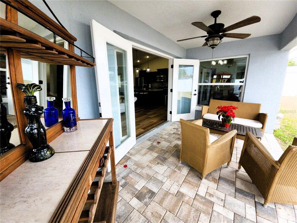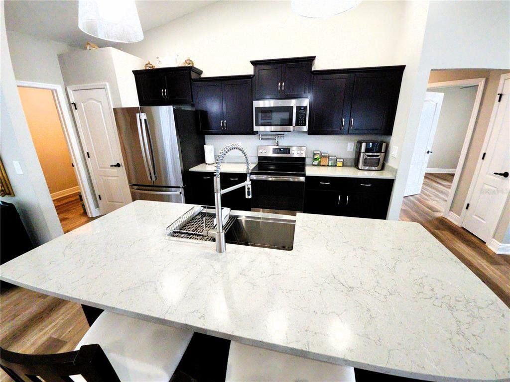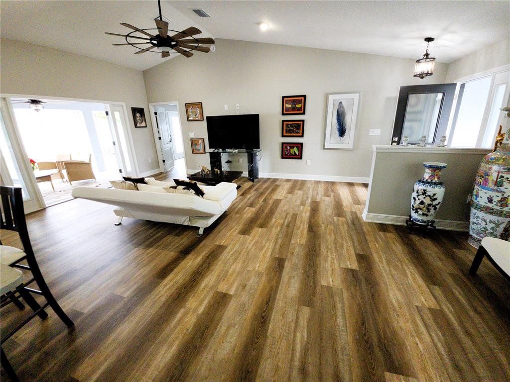 This modern 2023 custom built Pastore home has all of the high end finishes that set it apart from the rest. Entering into the open concept layout, from the luxury vinyl floors to the vaulted ceilings filled with high end lighting fixtures and remote controlled premium ceiling fan, this home is sure to impress. The great room comes complete with an additional space for seating, a piano, or whatever your heart desires. The living room opens up via French doors to a covered patio that comes with elegant pavers and looks out into a fully fenced private back yard. The kitchen comes complete with stainless steel electric range with pot filler spout, refrigerator, dish washer, and microwave. The bar style kitchen island that overlooks the living room features a deep stainless steel farm sink along with a premium faucet with built in sprayer and a garbage disposal. The island also has seating for four to facilitate entertaining as you cook. With the dining room being adjacent to the kitchen, setting up for dinner will be a breeze. In this split floorplan home, the primary bedroom comes complete dual closets and an ensuite master bath that has a separate walk in shower with dual shower heads, soaking tub, and private toilet. The brightly lit double vanities set above quartz countertops with dual sinks are absolutely elegant. The Patio can also be accessed from the primary bedroom through French doors. At the over end of the home you will find two guest bedrooms with elegant ceiling fans and luxury vinyl. There is also a guest bathroom with a tub/shower combo and quartz counter top that can be easily accessed from either guest bedroom. The spacious 3 car garage leads directly to the indoor laundry room that comes complete with washer and dryer. This home is Situated in a non HOA neighborhood that is conveniently located in the heart of Spring Hill with easy access to the sun coast expressway.