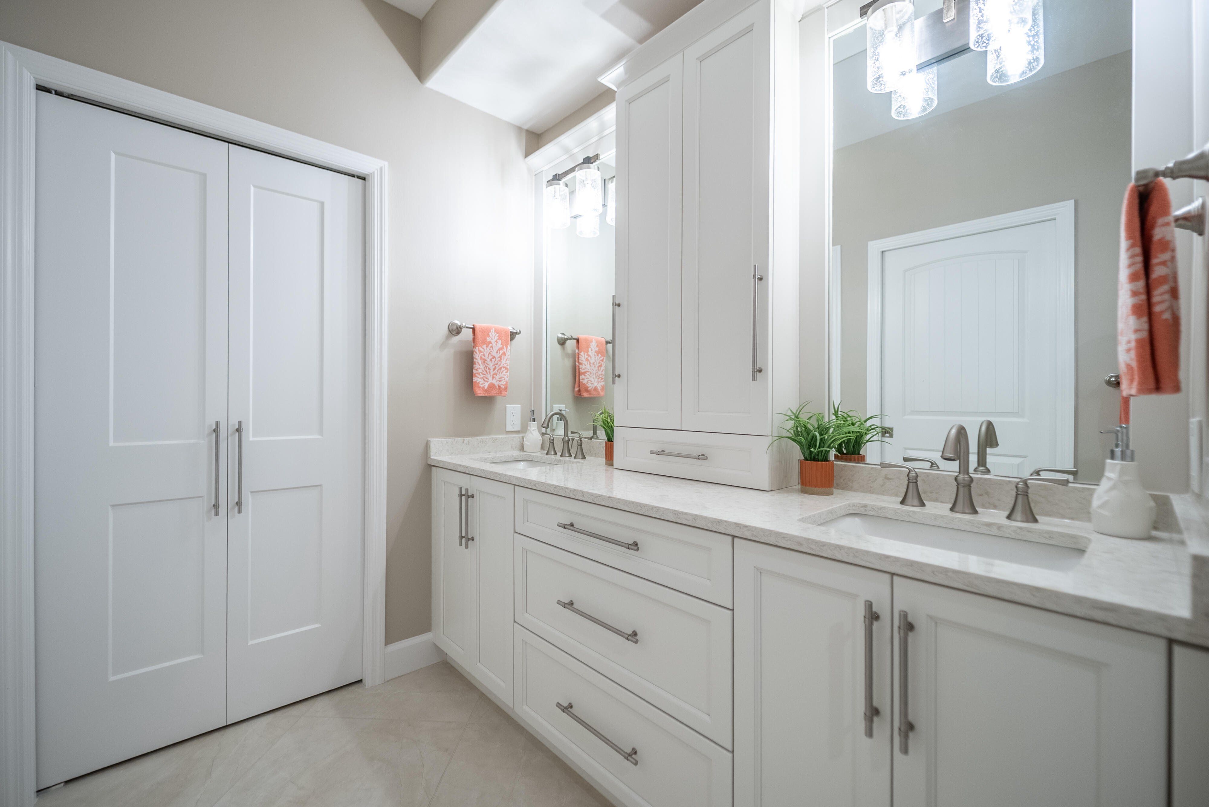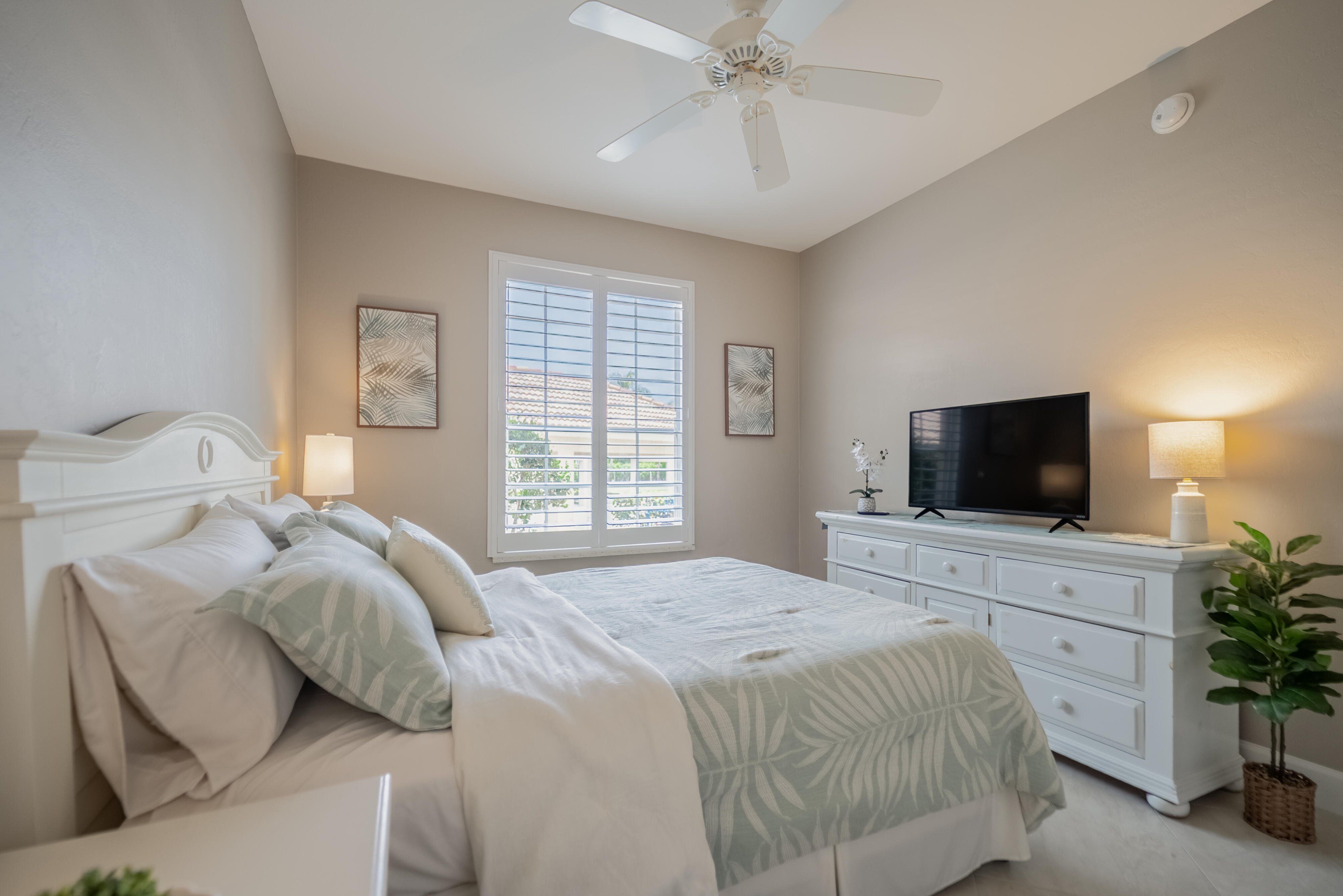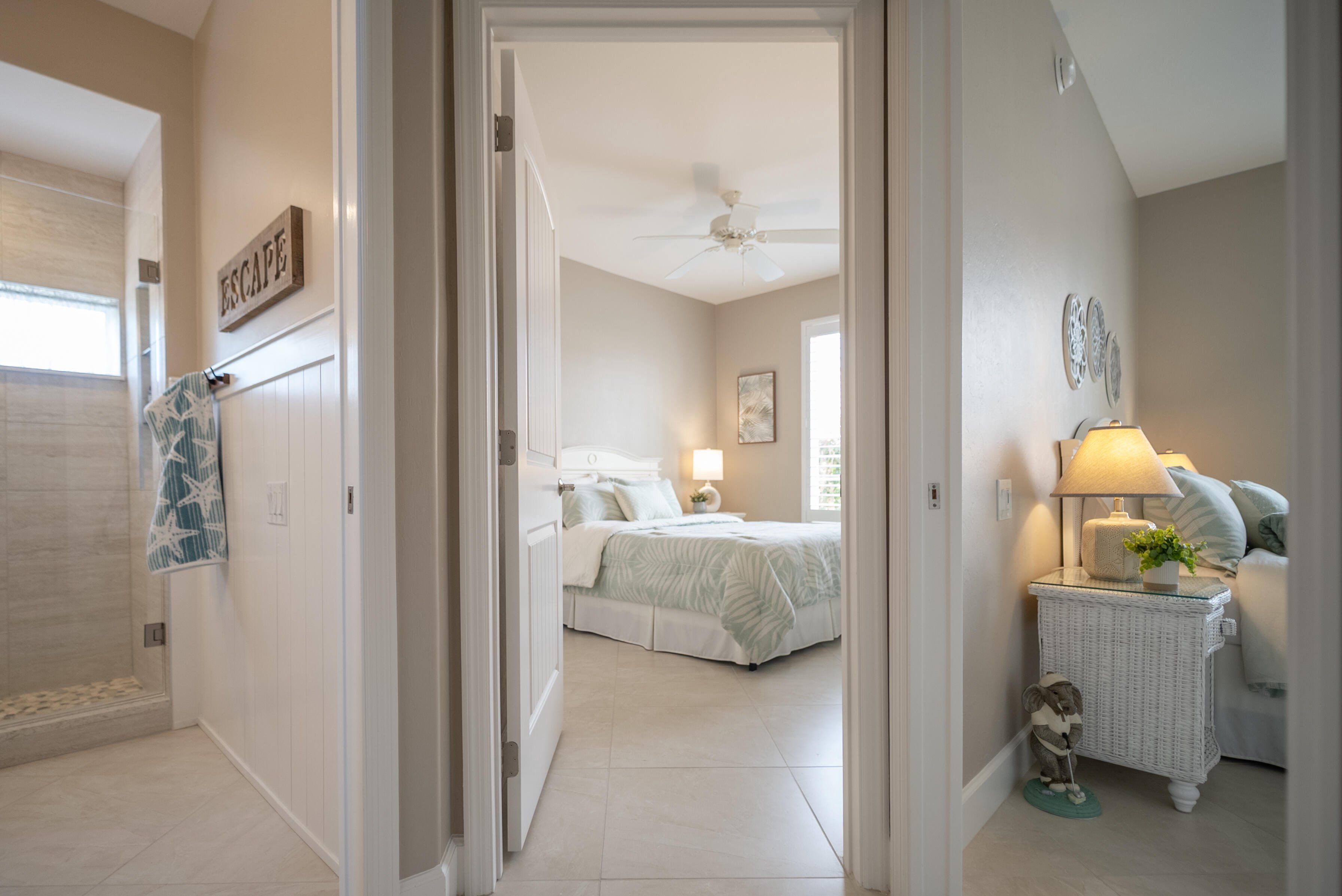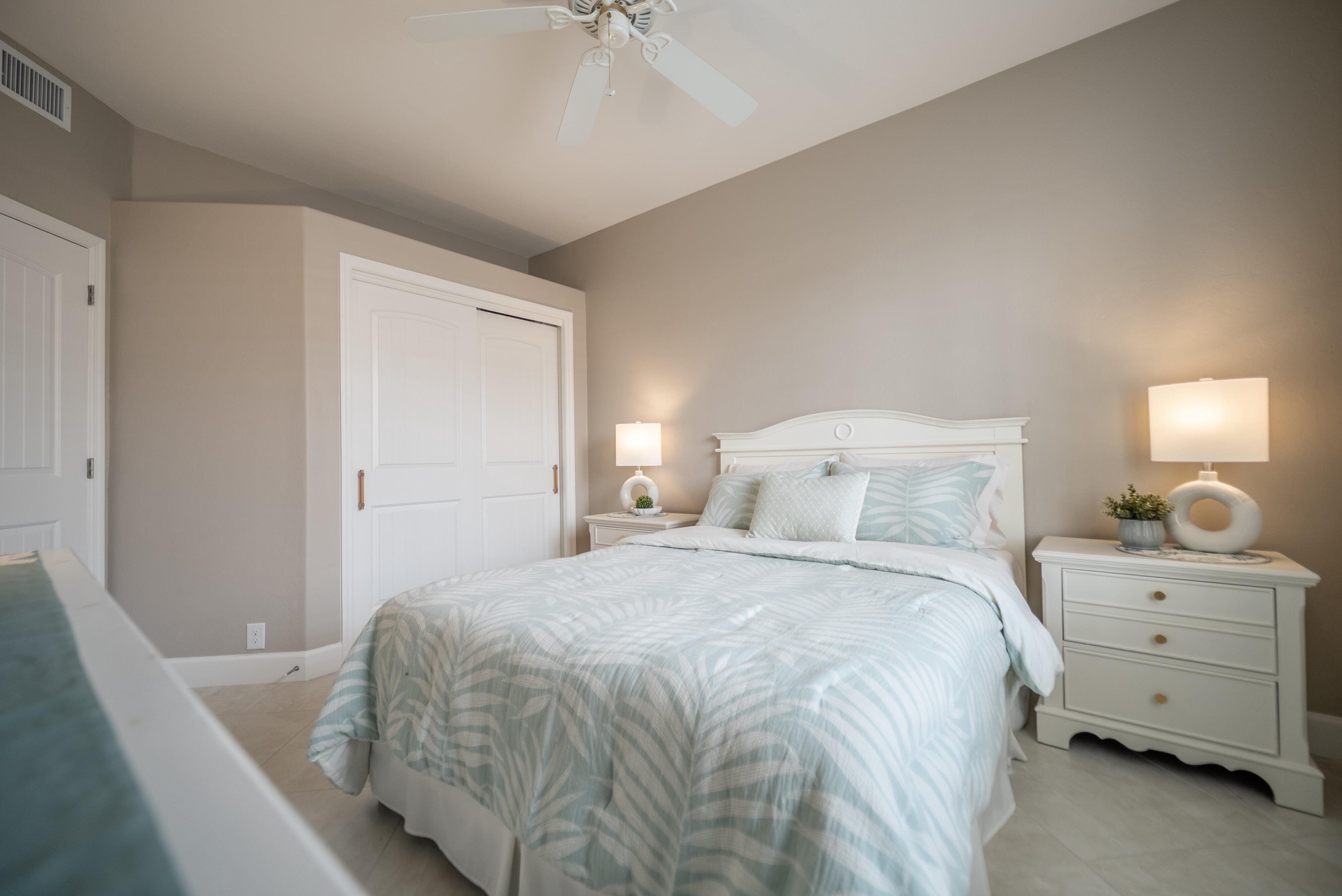 =============The primary suite features a king-size bedroom, sliding glass doors to the lanai, and a luxurious en-suite bath with a tile walk-in shower, complete with built-in shelving, dedicated linen storage and a walk-in closet with a custom closet system. Two guest bedrooms, each furnished with queen beds, are thoughtfully separated by a pocket door creating a private guest wing, providing ideal accommodations for visiting family and friends. The wing delivers an en-suite-like experience with a full guest bath that includes a tile walk-in shower, again with built-in shelving and a linen closet.