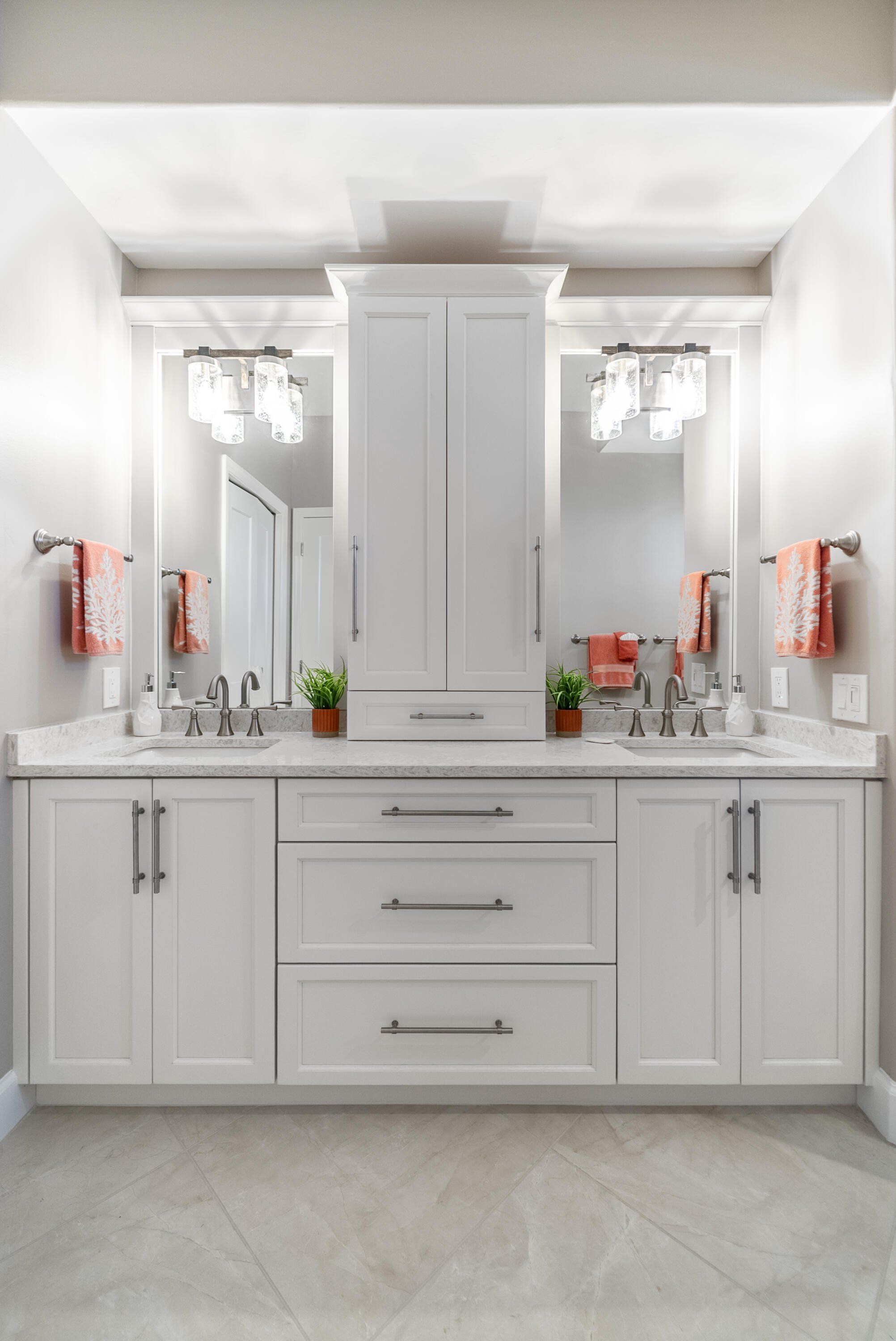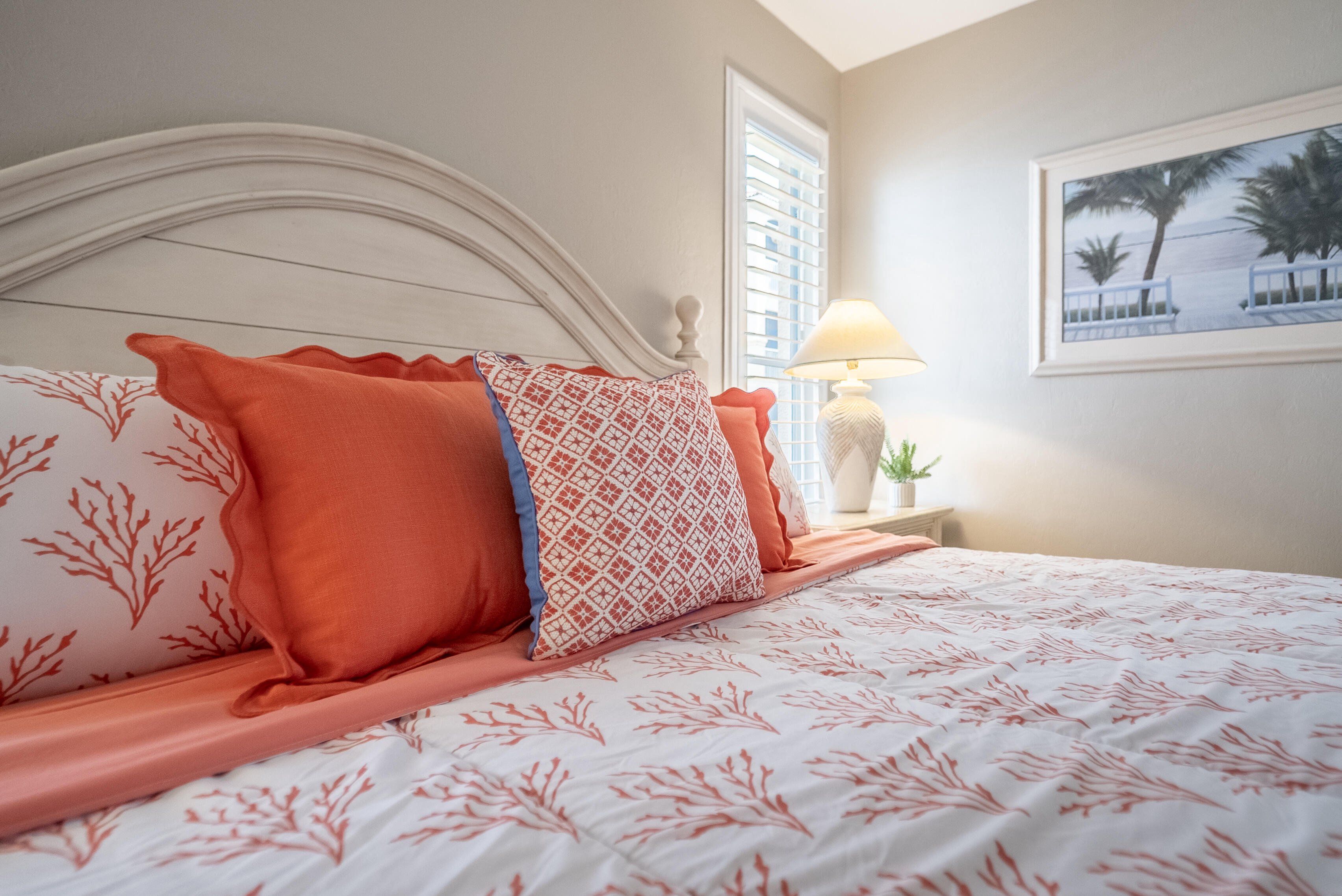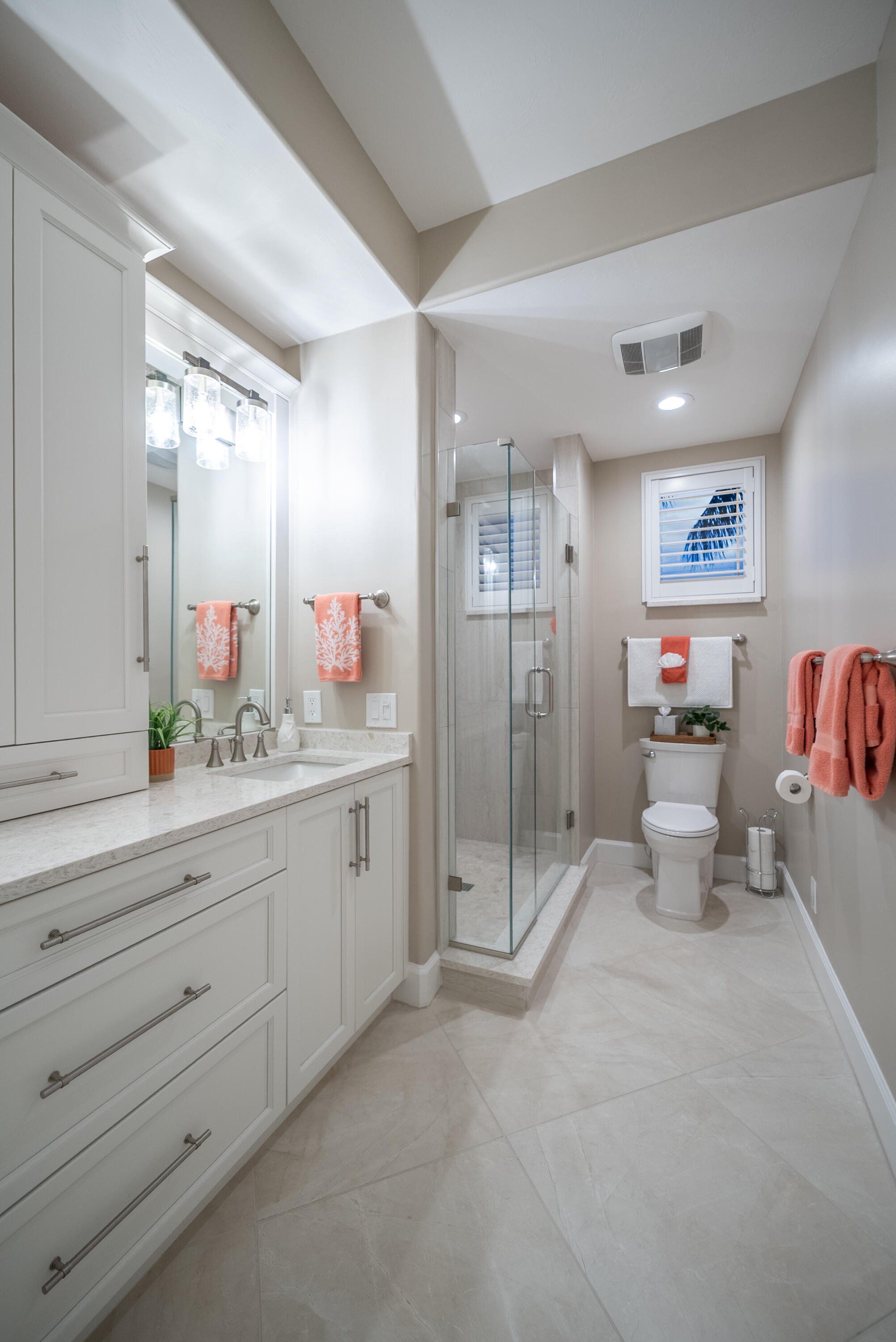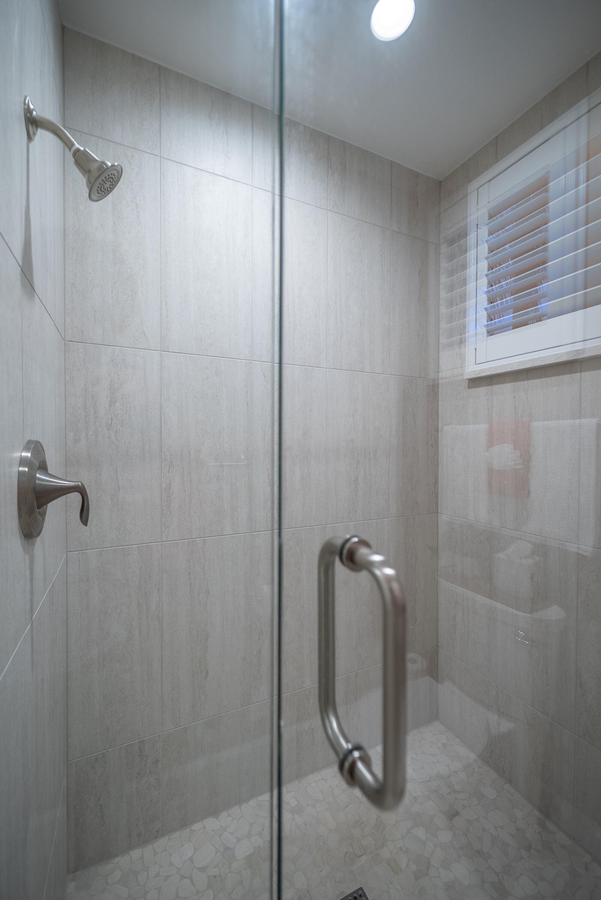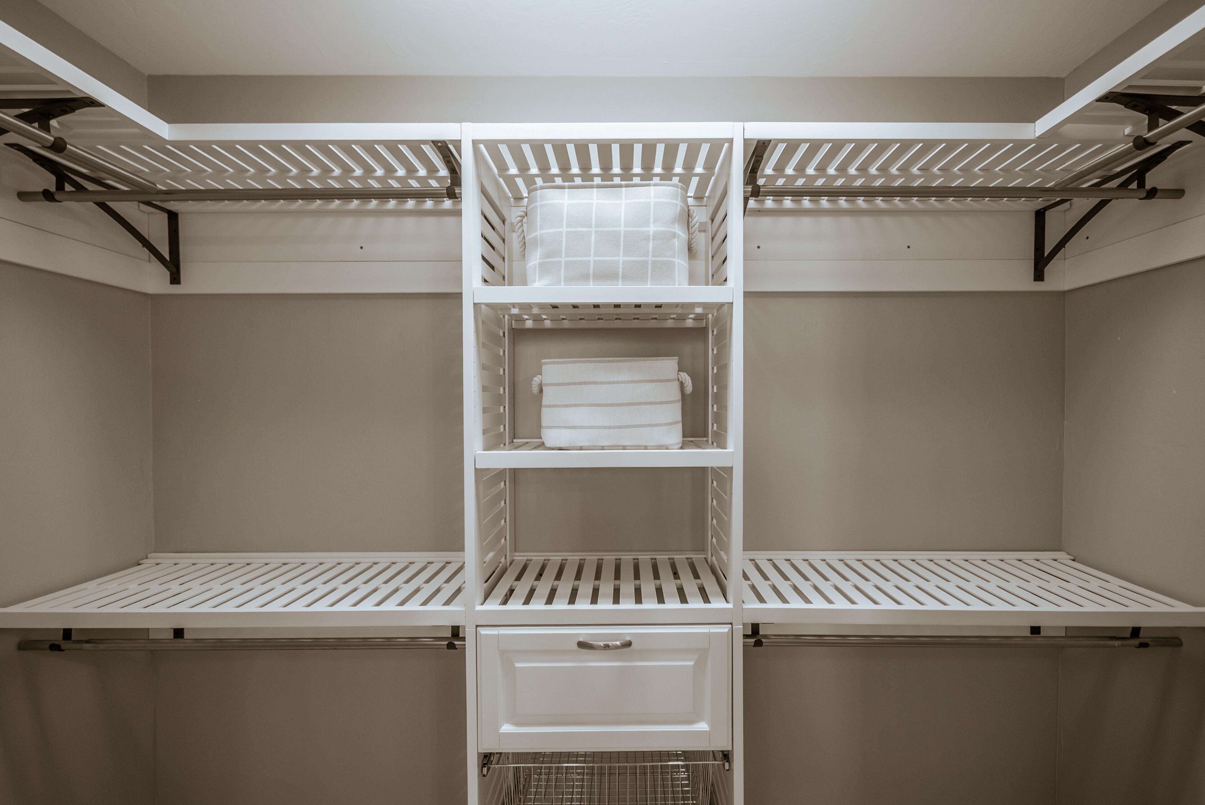 =============The primary suite features a king-size bedroom, sliding glass doors to the lanai, and a luxurious en-suite bath with a tile walk-in shower, complete with built-in shelving, dedicated linen storage and a walk-in closet with a custom closet system. Two guest bedrooms, each furnished with queen beds, are thoughtfully separated by a pocket door creating a private guest wing, providing ideal accommodations for visiting family and friends. The wing delivers an en-suite-like experience with a full guest bath that includes a tile walk-in shower, again with built-in shelving and a linen closet.