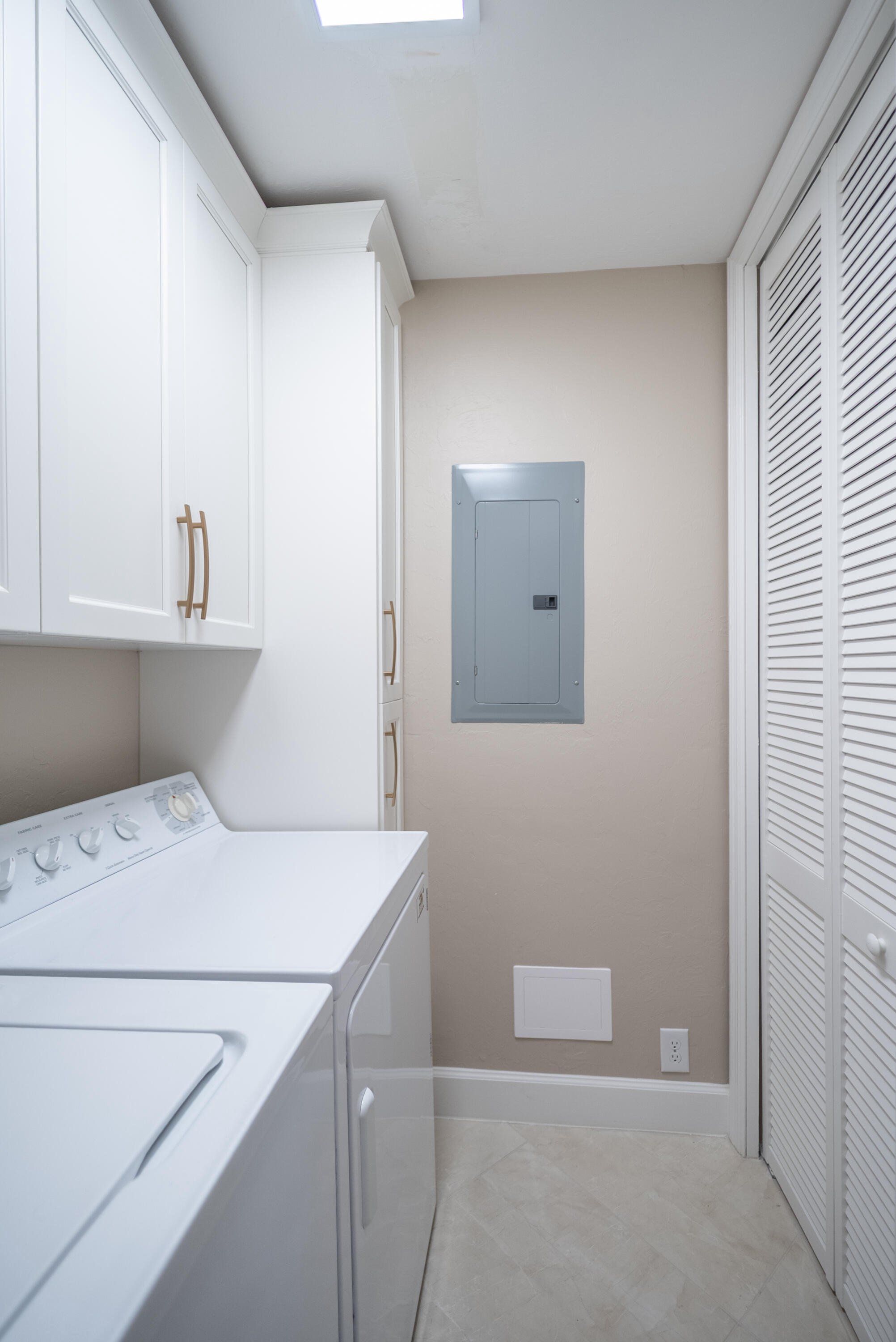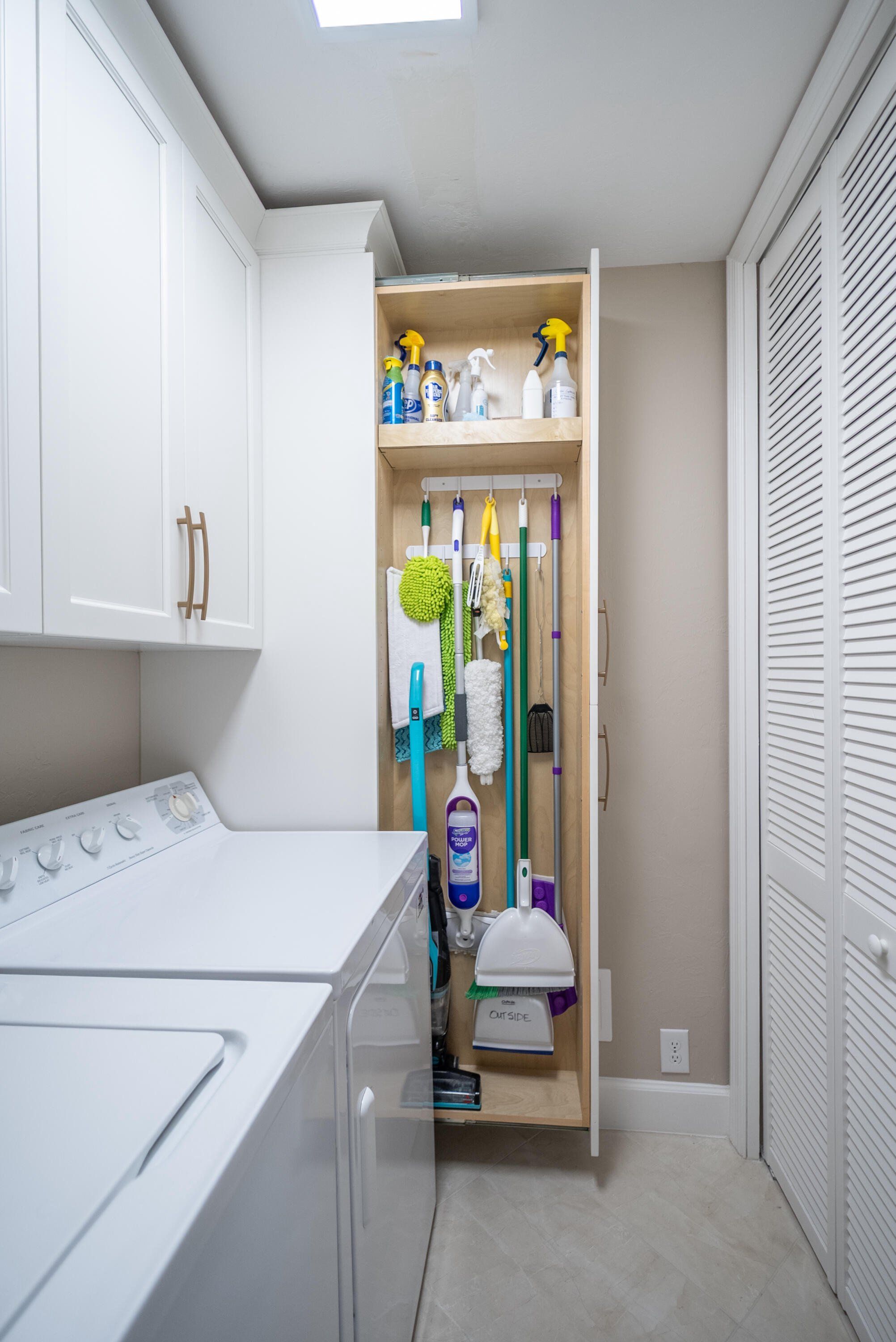 =============Additional highlights include a custom laundry room with built-in cabinetry and a custom-made pull-out storage for brooms, vacuums, and household essentials. Sliding glass doors in both the living room and primary bedroom lead to the large screened lanai with new aluminum framing and supports. A screened front entry with an outdoor storage closet provide ideal space for bikes, beach gear, hoses, or a shop vacuum.