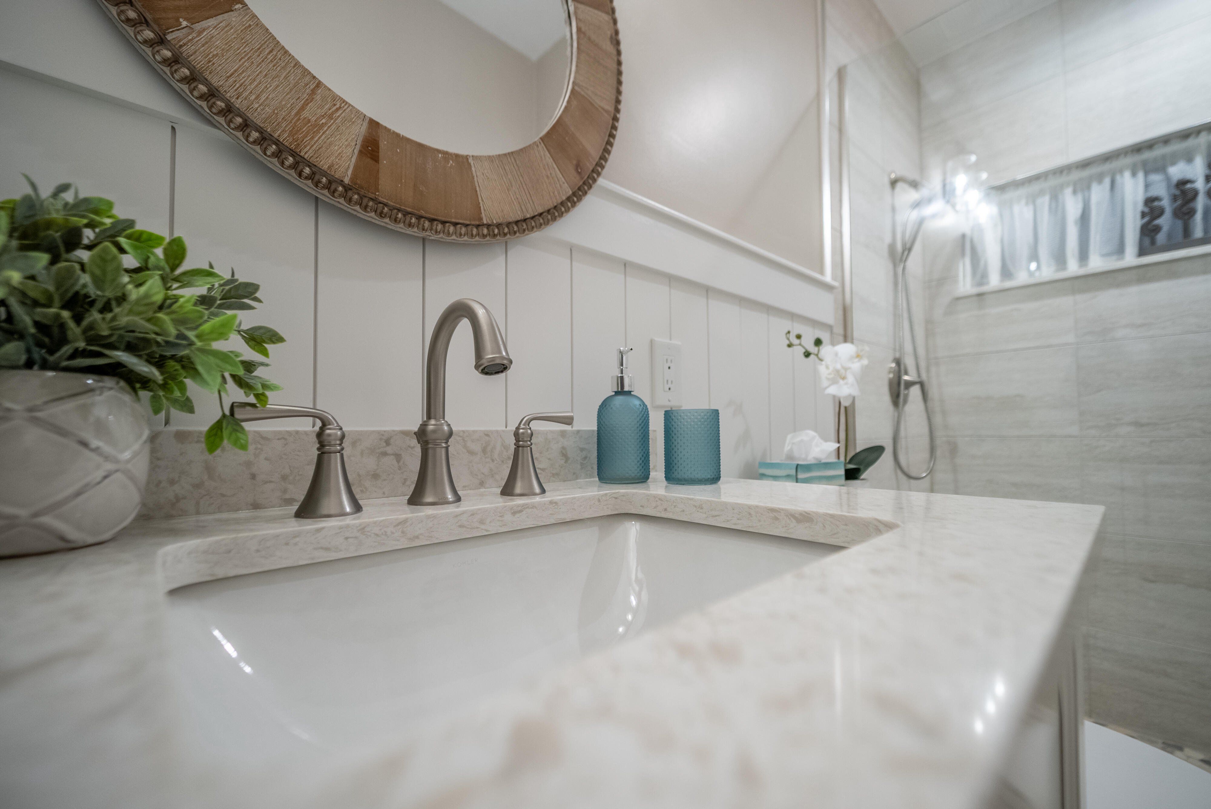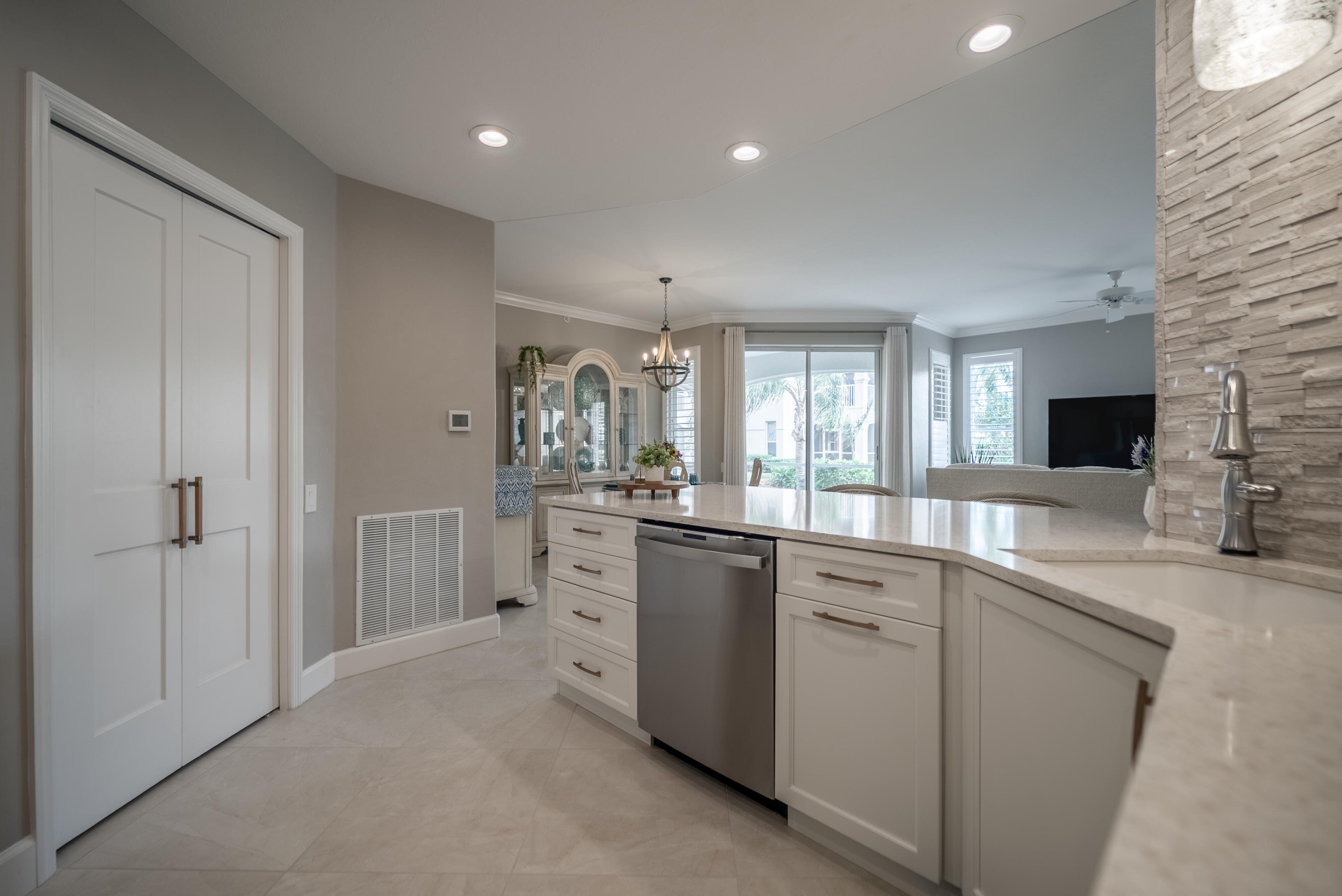 =============This fully renovated, turnkey 3-bedroom, 2-bath end-unit condo provides refined coastal living with no expense spared and absolutely nothing dated, creating the ideal Florida retreat for seasonal or permanent residents seeking comfort, quality, and effortless living. Thoughtfully designed as a forever home, the residence features 24x24 porcelain tile throughout, oversized baseboards, crown molding, and custom cottage-style interior doors, creating a cohesive, elevated feel from the moment you enter. As a south-facing end unit, every room is flooded with natural light, further enhanced by brand-new plantation shutters and custom quartz window sills that perfectly match the countertops throughout the home.