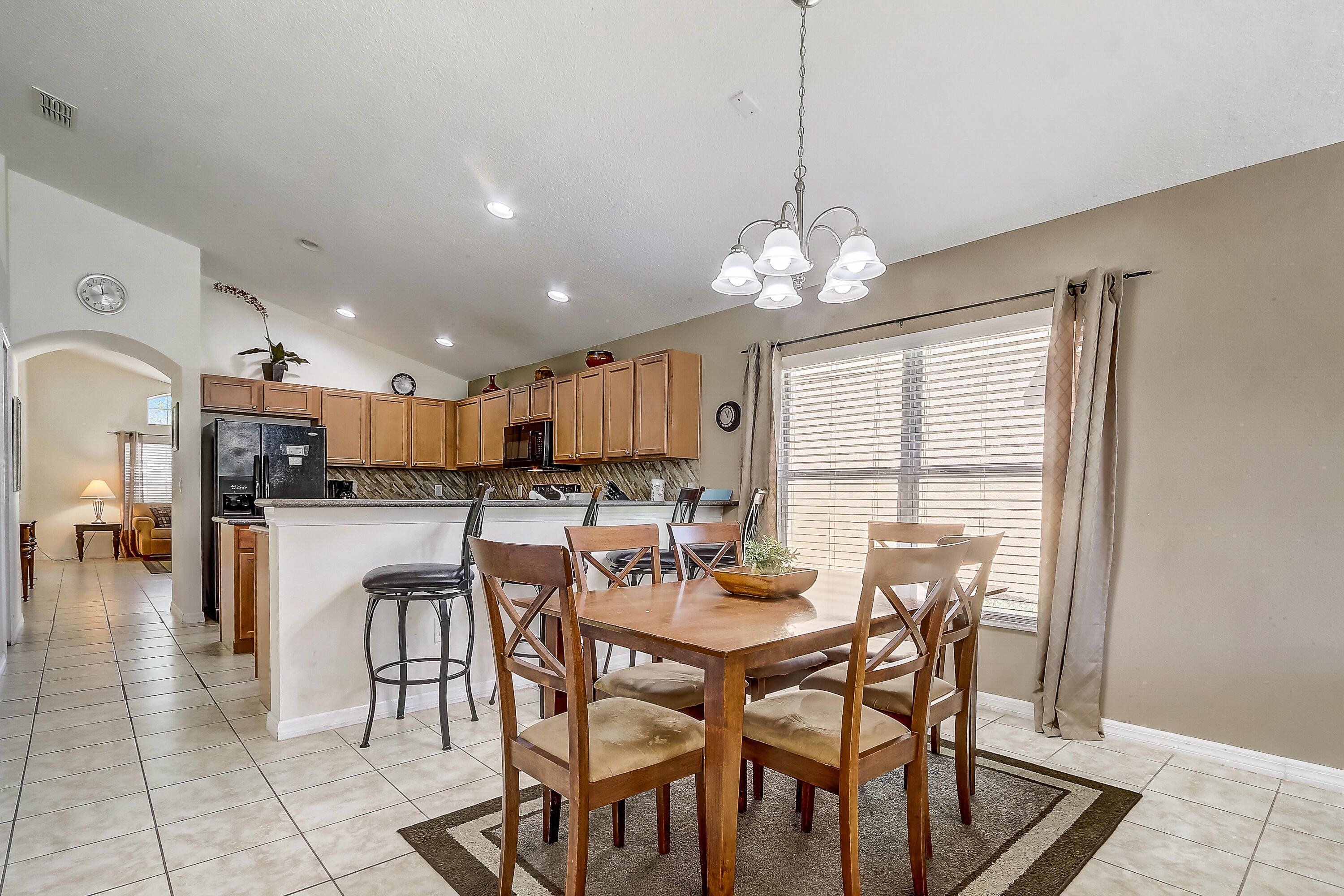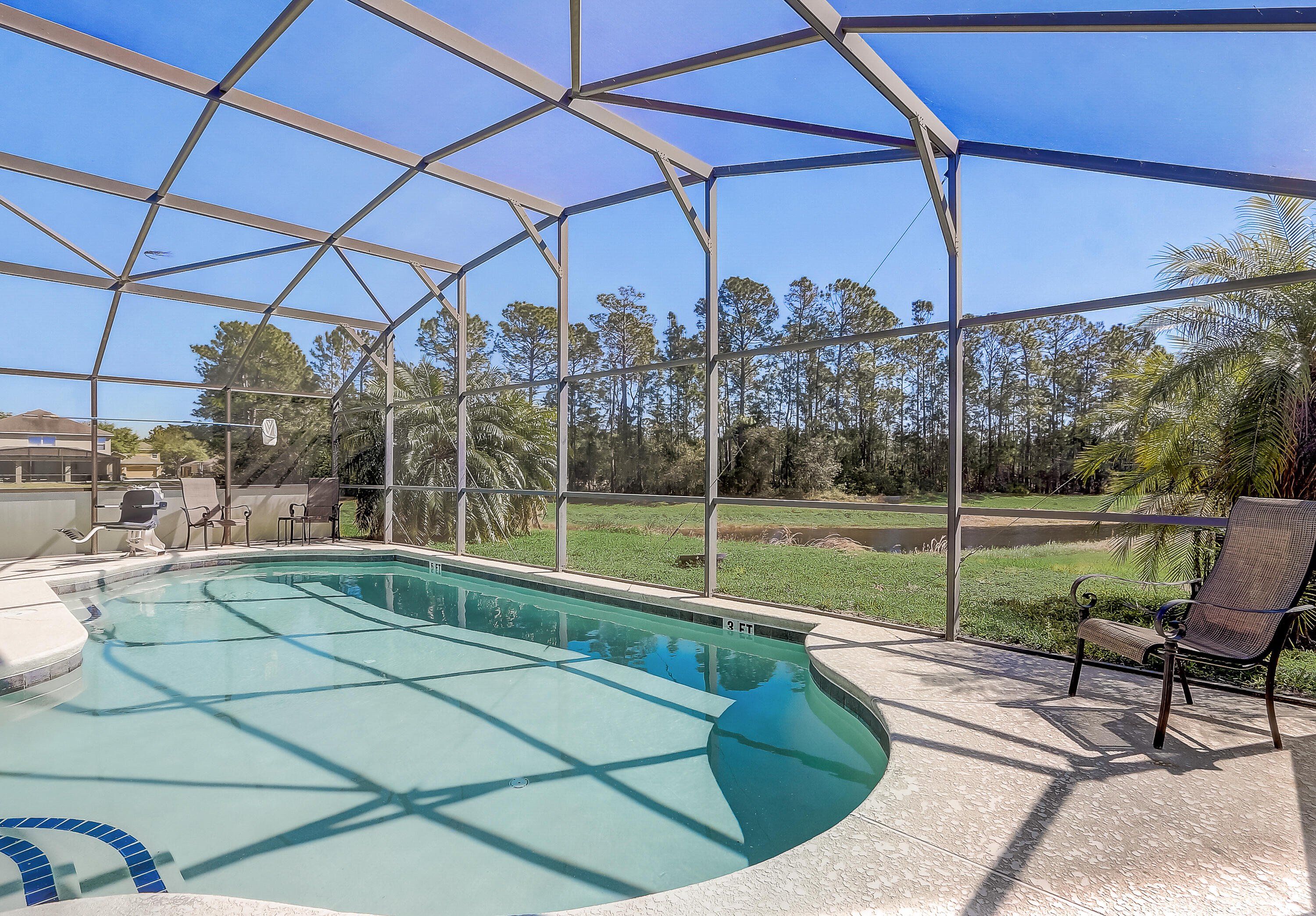 Beautiful 4 bedroom 3 full baths. Cable, internet, lawn care, 24 security all included. This house was the model home at one point. Vaulted ceilings and very large lanai. Fully furnished. 24 hrs gated community. This house makes it an incredible and unique rental income. Very well taken care of. Owners hand on fixing every little detail. It has a commercial electric pool lift. Pool screens have a privacy film. BRAND NEW Motor. The pond and the forest right outside.The garage is fully closed and insulated with an a/c system. Pool heater was install 3 years ago also has a system to turn the heater on and off by an app. House has an a/c system that if a door or window is open for more than 90 seconds the a/c gets turn off saving the owners money in electricity bill. House gets booked a lot, booking can be transfer to new owner. Sprinkler system less than 1 yr. A/C gets service twice a year. House is located super close to the clubhouse. Vaulted ceiling and several fans around the house. The community amenities are two houses way it has a clubhouse, which includes a fitness center, lounge area, large pool, playground, business center. Hard wire cameras no monthly fee.
