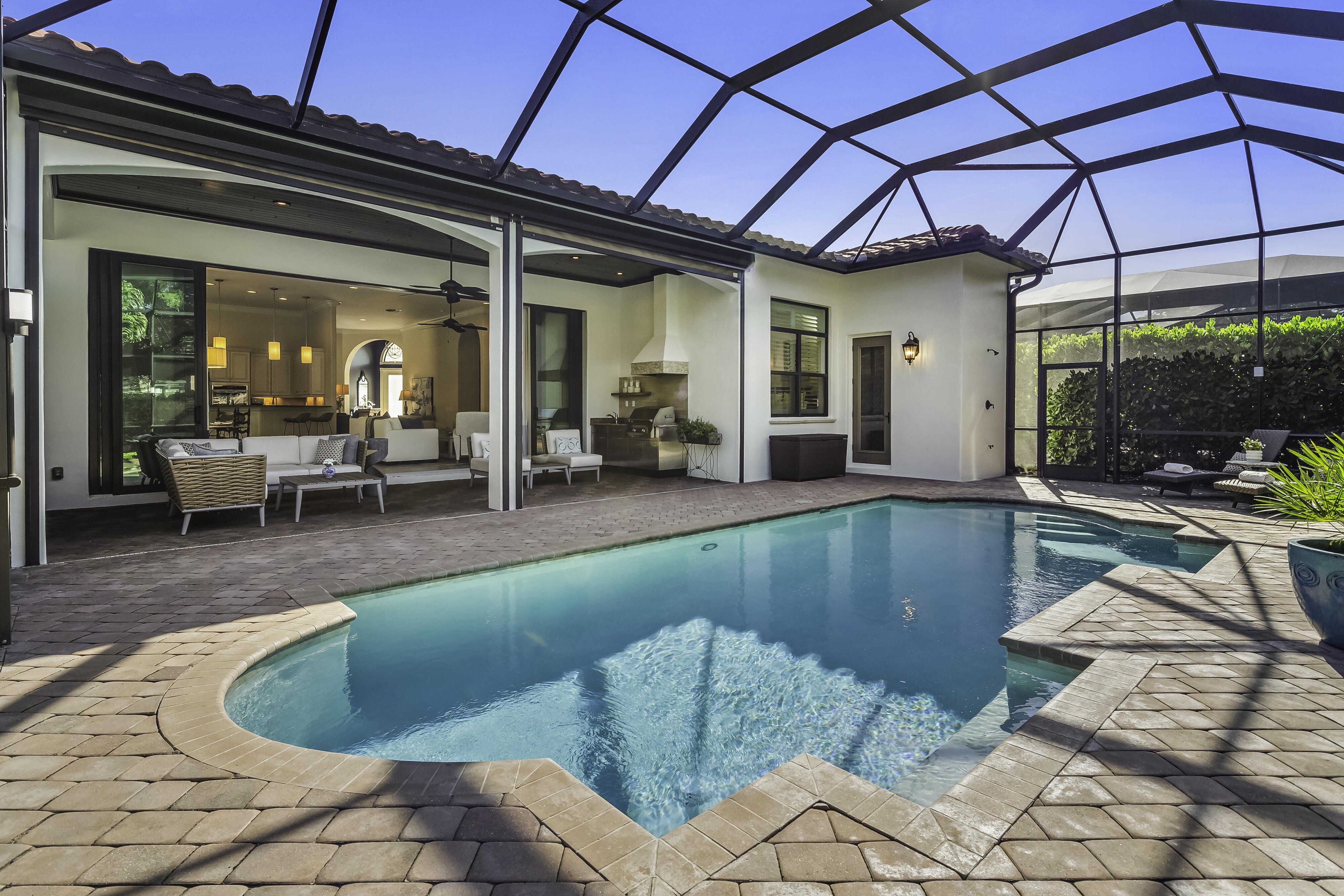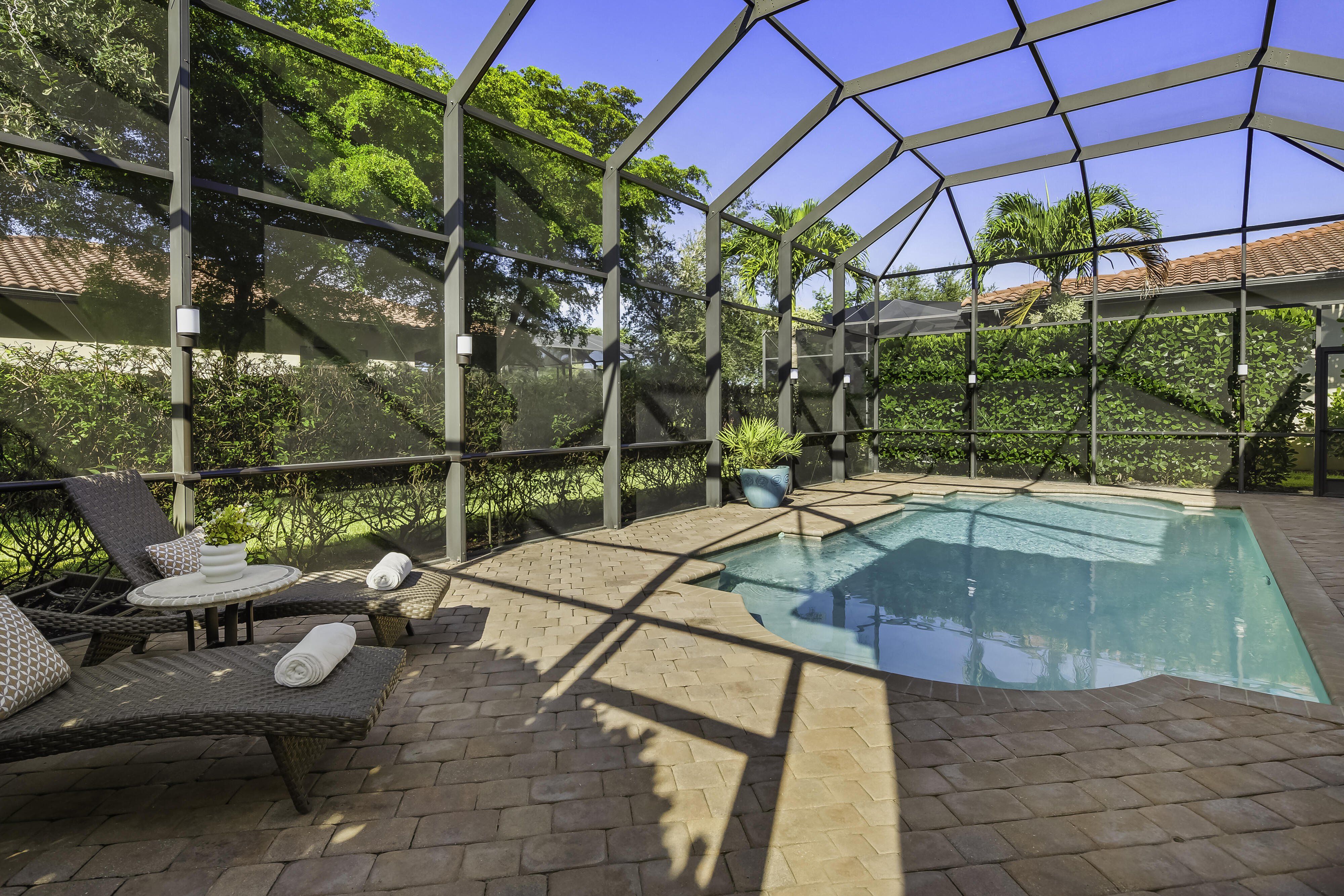 Welcome to the LOWEST PRICE PER SQ/FT of single family homes available in Treviso Bay, the world class resort gated community just 5 miles south of downtown Naples. Experience the elegance of a move-in ready Taylor Morrison partially furnished executive home, recently receiving a TOTAL EXTERIOR MAKEOVER & 2 NEW LENNOX HVAC SYSTEMS. With a courtyard gated entrance, this spacious 2935 sq ft home is a bright, open-concept family retreat with modern finishes, a chef's kitchen, and backyard built for entertaining. It features 3-4 bedrooms (or den/office), 3 full/2 half baths, a formal dining room adjacent to a well-appointed kitchen with gas stovetop & double oven & reverse osmosis sink faucet. 2 private guest suites with walk-in closets & full baths have their own wing, as does the primary suite at the opposite side of the house, with 2 custom finished closets & an expansive master bath. Wall to wall sliders open to a SW facing screened & heated pool for year-round enjoyment. Multiple lanai upgrades enhance the quiet privacy of your backyard oasis, including outdoor kitchen & shower, half bath & electric storm shutters. 12 foot ceilings, all tile/wood floors, custom light fixtures & window treatments, all bedrooms with walk-in closets, solid core doors, storm impact windows, tankless gas water heater, Bosch fridge, & whole house water softening system all contribute to the home’s allure. Key amenities center is walking distance from home, which includes 8 tennis courts, 3 bocce ball courts, basketball court, fantasy-lap-baby pools, tiki sports bar, fitness & spa centers, his/her saunas and bike/dance studio. 8 pickle ball courts, 5 remote pools & 17 miles of stress free paved bike riding are complemented by (18) activity clubs available for social interactions. TPC golf access May-Oct.